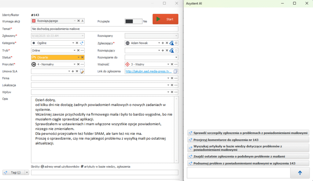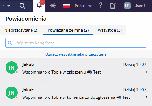 W Helpdesku użycie „@” w opisie zgłoszenia lub komentarzu pozwala na oznaczenie konkretnego użytkownika. Oczywiście otrzymuje on stosowne powiadomienie, gdy zostanie wspomniany. W ustawieniach dostępna jest opcja umożliwiająca automatyczne dodawanie wspomnianych użytkowników jako użytkowników powiązanych ze zgłoszeniem, a w ustawieniach konta pocztowego można włączyć powiadomienia mailowe informujące o wspomnieniu użytkownika w komentarzu lub opisie zgłoszenia.