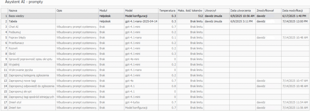 Prompty systemowe są teraz w bazie i są edytowalne (z opcją „Przywróć domyślne”). Każde z poleceń posiada standardowy identyfikator StdId.