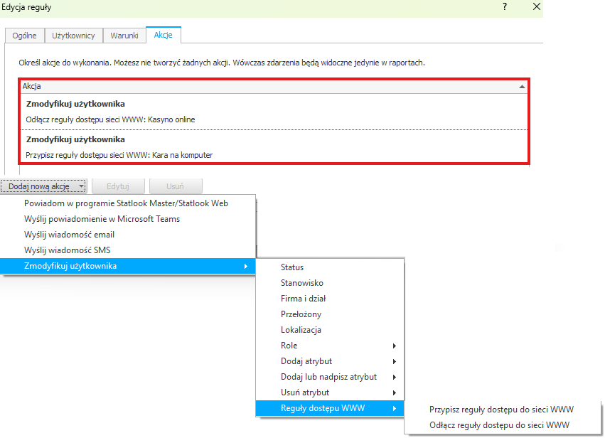 W regułach związanych z użytkownikami dodaliśmy akcje „Przypisz reguły dostępu do sieci WWW”/„Odłącz reguły dostępu do sieci WWW”.